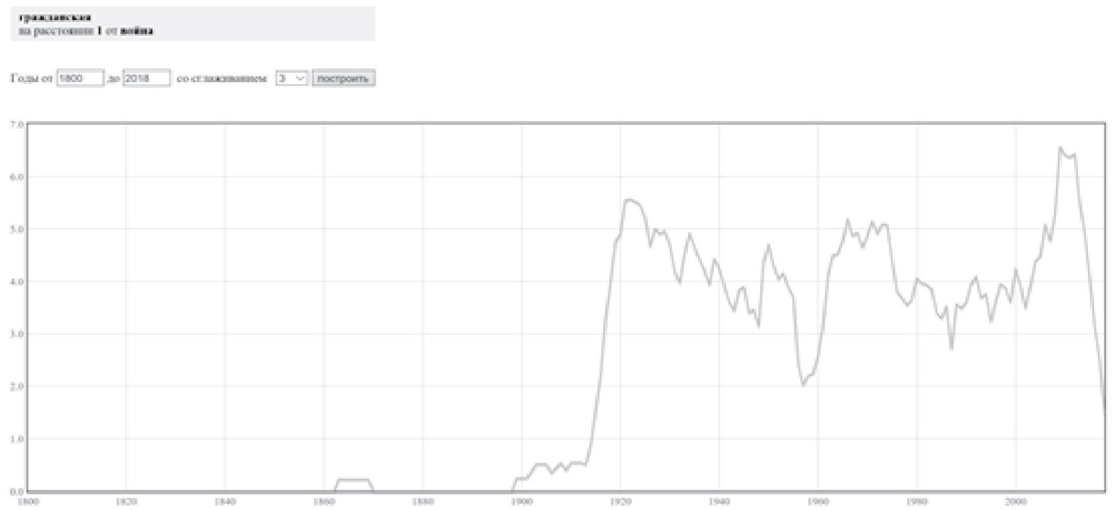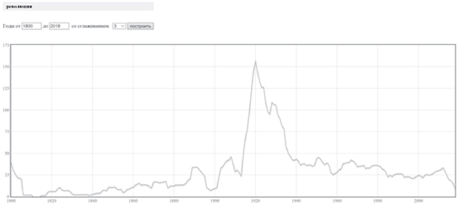 鉴于此,笔者认为有必要从语言学的角度探讨一下革命和内战产生的源头和使用轨迹。从俄语国家语料库中可以看到“革命”和“内战”(俄语中“гражданская война”一词来自德语,德语又翻译自罗曼语和英语)两个词条从1800—2018 年的使用动态。
