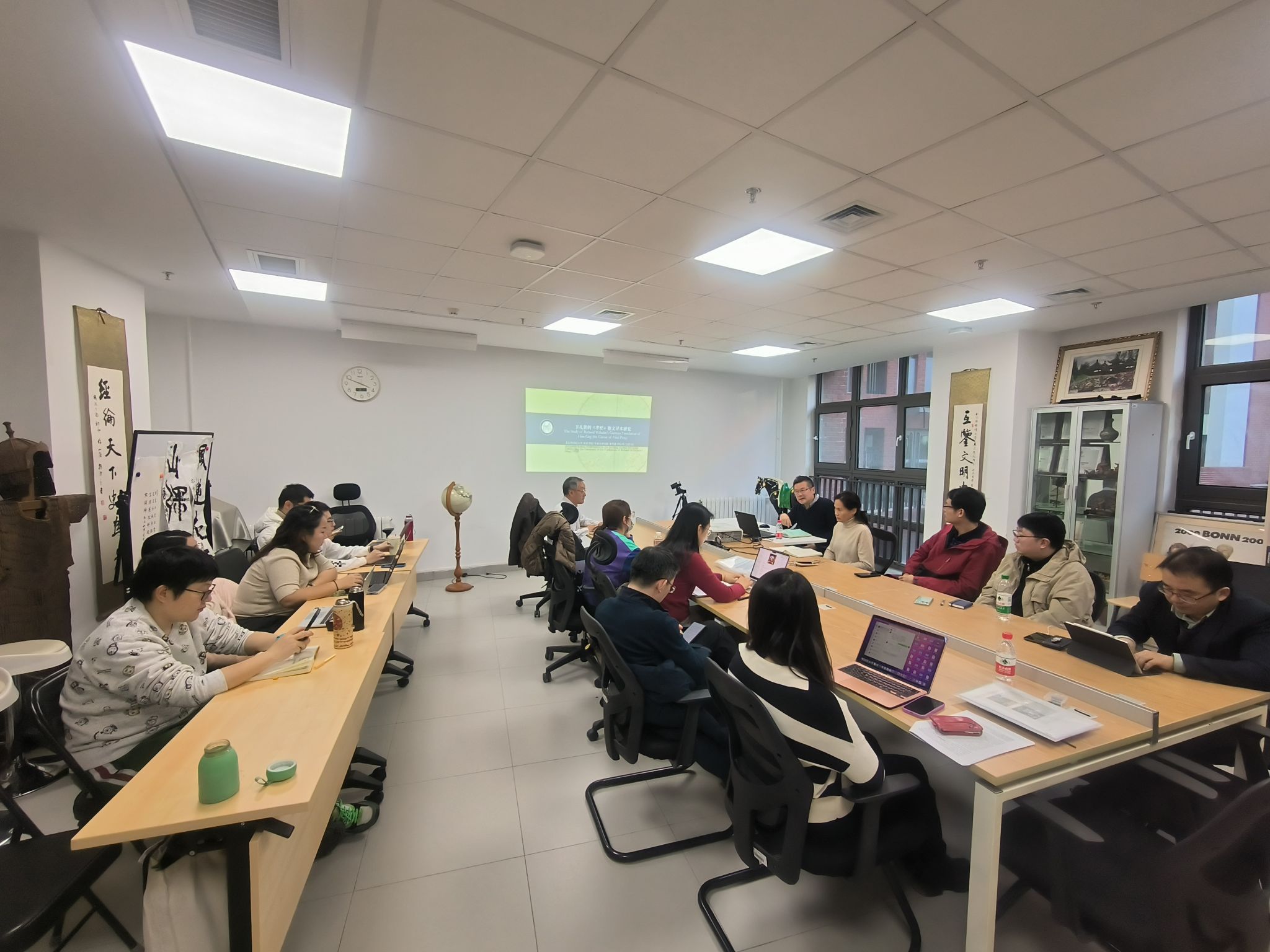 2024年12月4日学院召开例会,李雪涛院长介绍了下周学术活动的准备情况,姚胜副院长阐述了保密工作及论文指导工作的相关内容。关于学院工会工作,因马春玲老师退休,由学院的教代会代表高然担任学院的工会主席。会后李雪涛教授做了学术分享,与会老师就相关话题开展讨论。