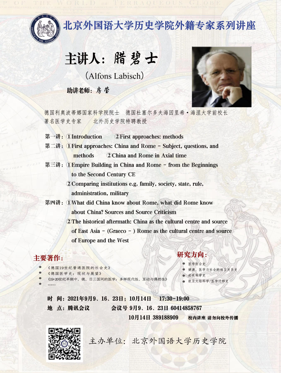 讲座专家:腊碧士,德国利奥波蒂娜国家科学院院士、德国杜塞尔多夫海因里希·海涅大学前校长、著名医学史专家、北外tyc86太阳集团特聘教授