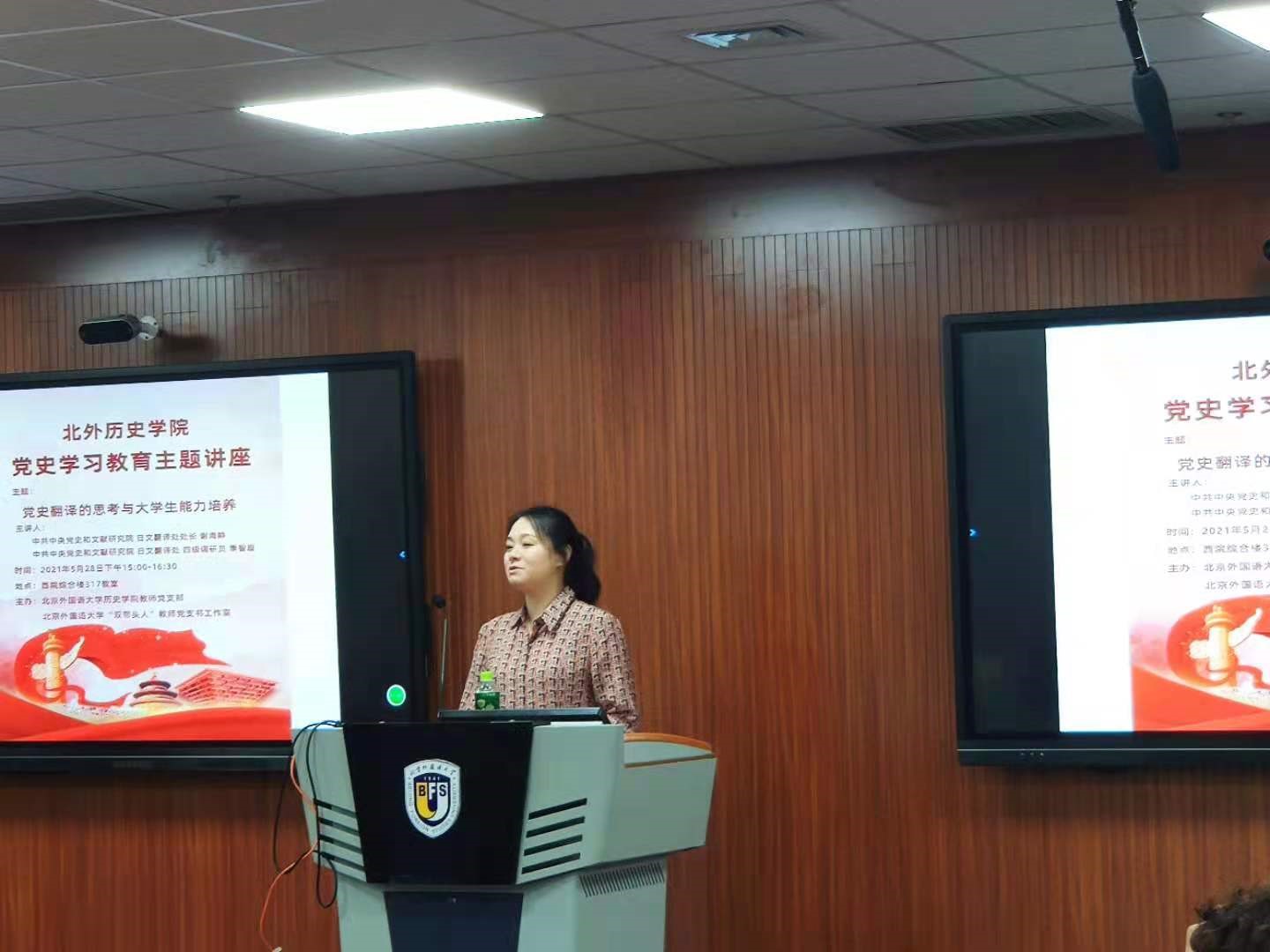 2021年5月28日下午三点,tyc86太阳集团教师党支部、“双带头人”教师党支书工作室在国际大厦317会议室举办了主题为“党史翻译的思考与大学生能力培养”的党史学习教育主题讲座。主讲嘉宾是中共中央党史和文献研究院第六研究部日文翻译处处长谢海静老师和四级调研员季智璇老师。tyc86太阳集团2019级、2020级本科生和研究生共计30名同学参加了活动,教师党支部书记董成龙老师和世界史教研室主任杨钊老师也一同参加了本次活动。本次主题讲座旨在让tyc86太阳集团的学生了解我党党史对外翻译的相关知识以及当下国家单位的用人需求。