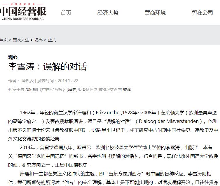 2014年12月22日,《中国经营报》在“慧及人生”栏目刊载了对我校全球史研究院院长李雪涛教授的专访。题目是:《李雪涛:误解的对话》。