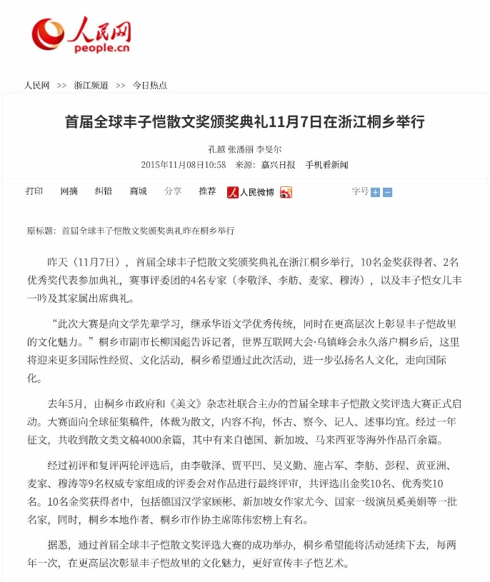 2015年5月30日,首届全球丰子恺散文奖经过专家组评审近日在丰子恺先生故里揭晓,我校全球史研究院顾彬教授的作品《悲哀中的欢乐》荣获金奖。