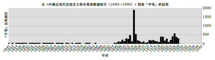 在中国传统思想中,提倡平等意识的还有佛家思想。但总体来说,相对于儒家差等伦理来说,平等观念的处境非常边缘,并不被一般的士人所接受。但是,到了19 世纪下半叶,在西方观念的冲击下,尤其在甲午战争(1895 年)之后,士大夫逐渐意识到平等观念与西方社会制度和思想资源的关系,14平等观念渐渐成为士大夫热议的西化观念之一,这一点通过《中国近现代思想及文学史专业数据库(1830—1930)》的数据分析可以看到(参见下表)。
