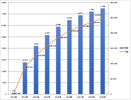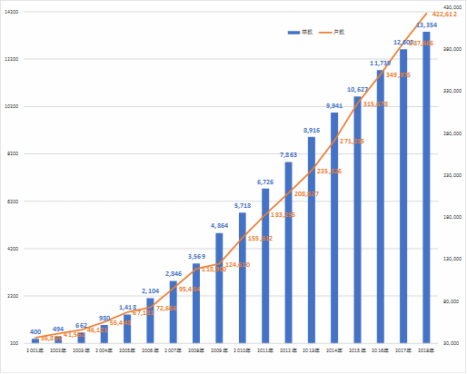 截至2019年8月,日本65岁以上的人口已经达到3582.9万人,占人口总数的比例(老龄化率)为28%;预计到2042年,将会迎来3920万人的高峰期,由于总人口的不断减少,老龄化率将会在2055年达到40.5%。[5] 而且,老年人口中有约七成是独居或者仅有老年夫妇单独生活的家庭,因为不能得到同居家人的生活支援,这部分独居老人对可以提供护理服务的养老住宅需求比较大,日本政府大力支持民营企业进行养老住宅开发。通过图1和图2可以看出,收费型养老院和服务型老年公寓的住宅数量和入住户数均呈逐年上升趋势,其中收费型养老院由于起步较早,其整体数量和入住户数要高于服务型老年公寓,到2018年共有13354栋收费型养老院,可入住422612户。服务型老年公寓虽然起步较晚,但是由于其入住门槛较低,政府在融资、税收等方面有一定的支持,因此得以在短时间内实现快速增长,到2019年日本全国共有7486栋服务型老年公寓,可入住249597户。