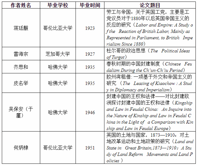 民国时期留美西洋史学者博士论文一览表
